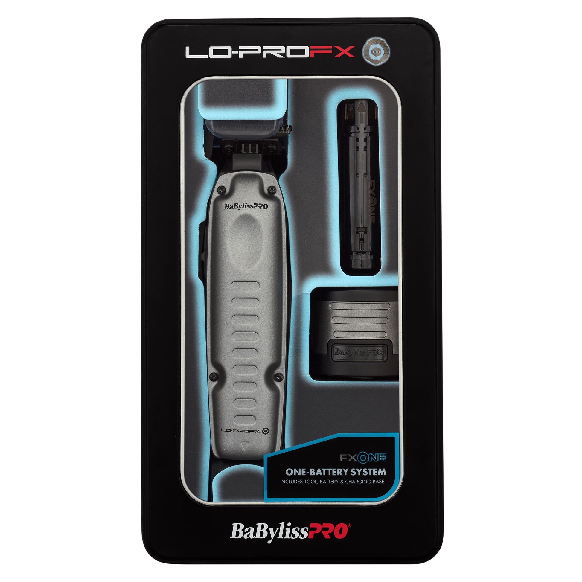 An entire ecosystem of tools based on ONE battery. Change the way you work with BaBylissPRO FXONE Lo-PROFX collection. BaByliss PRO FXONE Lo-PROFX Hair Trimmer is a high performance, ultra-low profile trimmer with a replaceable and interchangeable lithium battery pack. Quick battery release button and up to 2.5 hours of runtime. Blue DLC/titanium standard-tooth T-blade is hypoallergenic and zero gap adjustable. High torque, Italian-designed N1 brushless motor powers to 6,800rpm. Use this trimmer for crispy edge ups, hard lines and other detail work. Ultra-low profile metal shield cover with ergonomic grip for an incredibly intuitive feel.