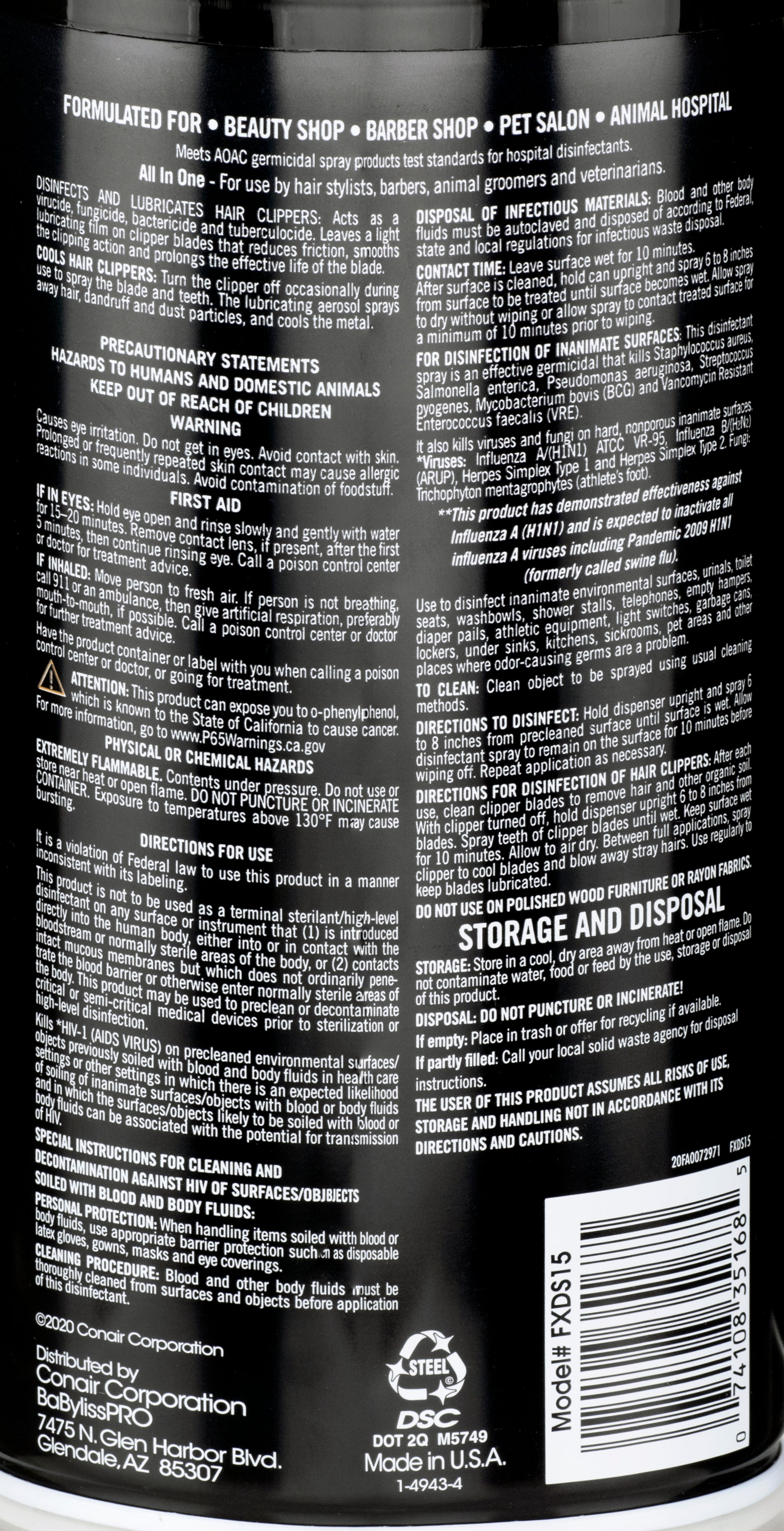 Formulated for the beauty shop, barber shop, pet salon and animal hospital. BaBylissPRO All in One Clipper spray is the spray which meets all your clipper needs. Disinfect, lubricate, cool and clean, and prevent rust with this clever spray. Kill bacteria, fungi and viruses on clippers, blades and scissors. Great for hair stylists, barbers, animals groomers and vets.