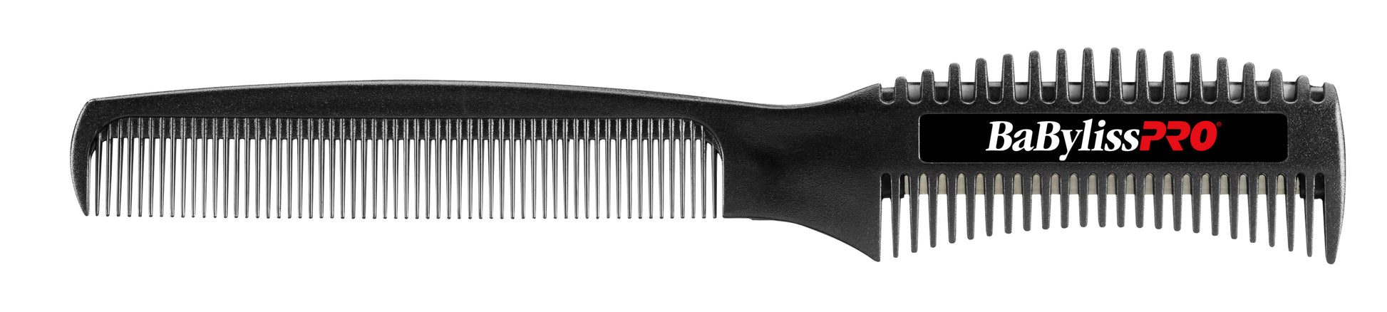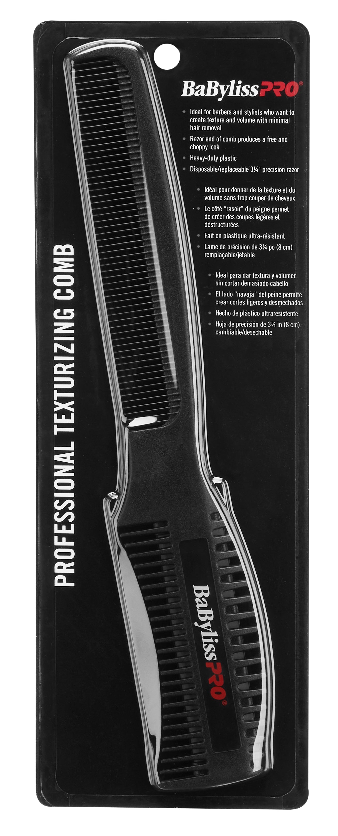 BaBylissPRO Professional Texturising Comb makes texture and volume ridiculously easy. Ideal for barbers and stylists who want to create texture with minimal hair removal, this heavy-duty plastic comb lets you customise any hairstyle. A precision razor on one end of the comb thins and adds texture, great for adding spikes to short hair along the crown. The other end of the comb is a regular comb.