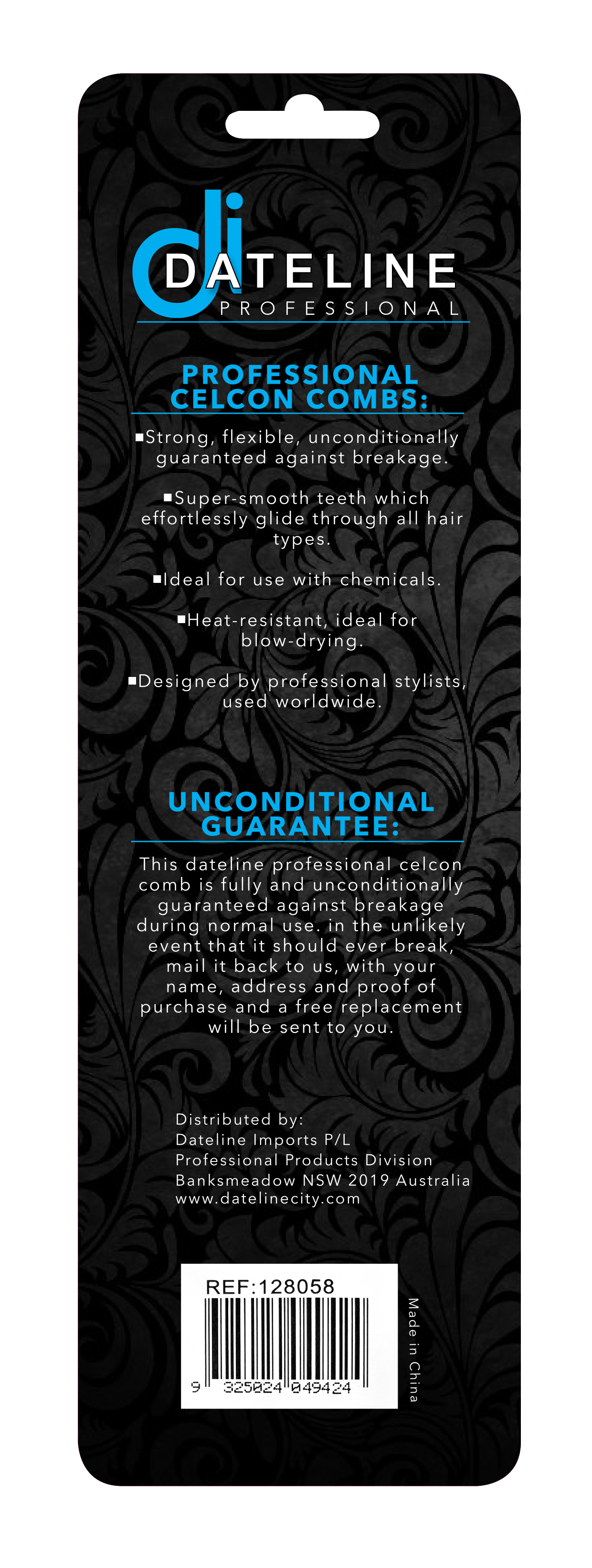 Quality without compromise since 1977. Dateline Professional Black Celcon 3832 Basin Comb is strong, flexible and unconditionally guaranteed against breakage*. With super-smooth teeth which effortlessly glide through all hair types, this comb is the perfect professional companion. Ideal for use with chemicals. Heat resistant and suitable for blow-drying. Perfect for detangling wet or dry hair, detangling after shampooing, combing through toners, combing out teasing or waves and combing colours through hair for even saturation. Designed by professional stylists and used worldwide.