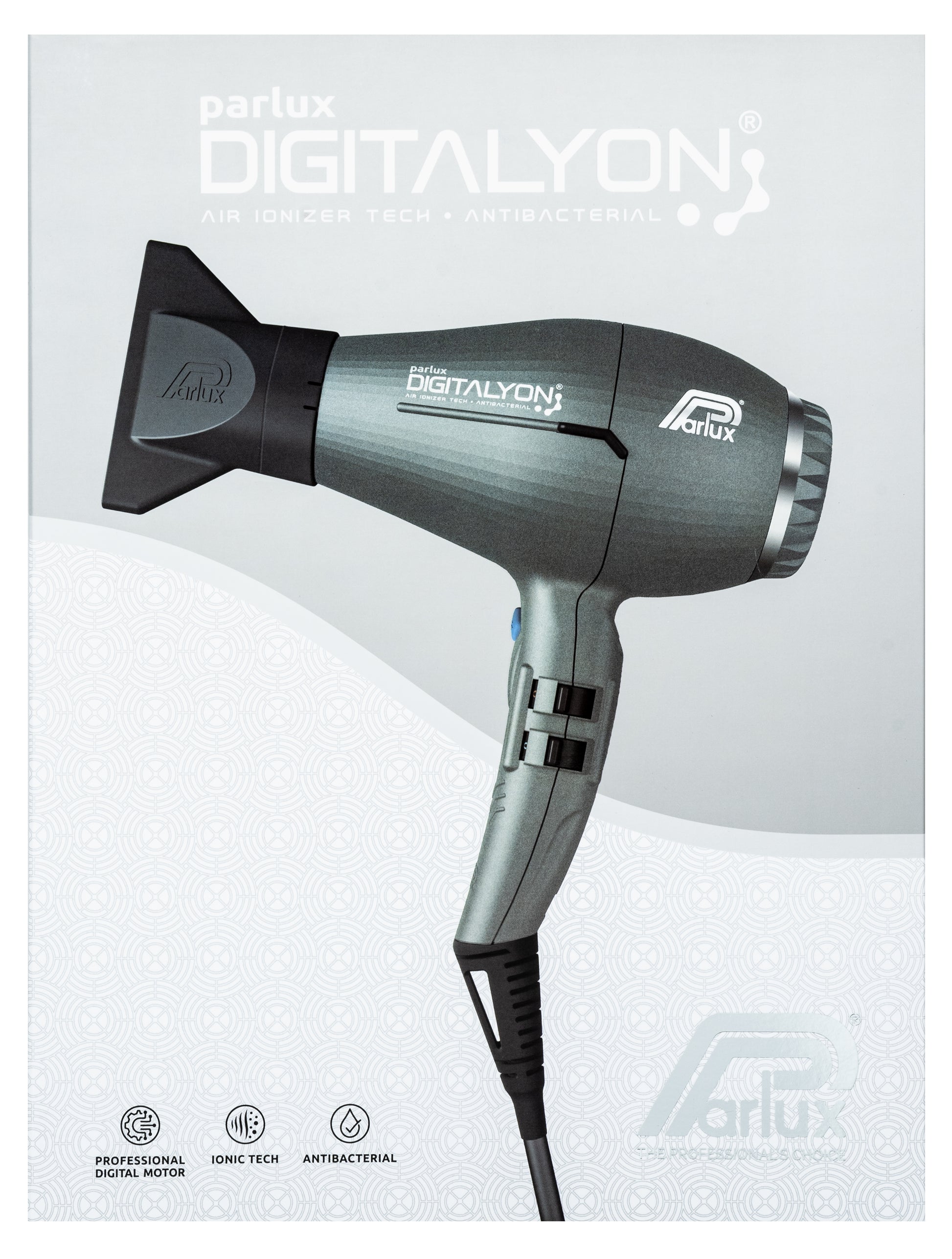 Parlux goes digital. Parlux DigitAlyon Air Ionizer Tech Antibacterial Hair Dryer is more powerful, more lightweight and more quiet. With the ultra-long life digital motor delivering an airflow of 88m3/h, all-day salon styling becomes a breeze. New, wave heating element with variable geometry increases power to an astounding 2400 watts. Air Ionizer Tech ionic and ceramic technology softens hair and imbues shine while speeding up drying time. Special antibacterial paint creates an unfavourable surface for the proliferation of microorganisms and helps maintain hygiene during use. Exceptionally lightweight, ergonomic and perfectly balanced. This is the digital revolution.