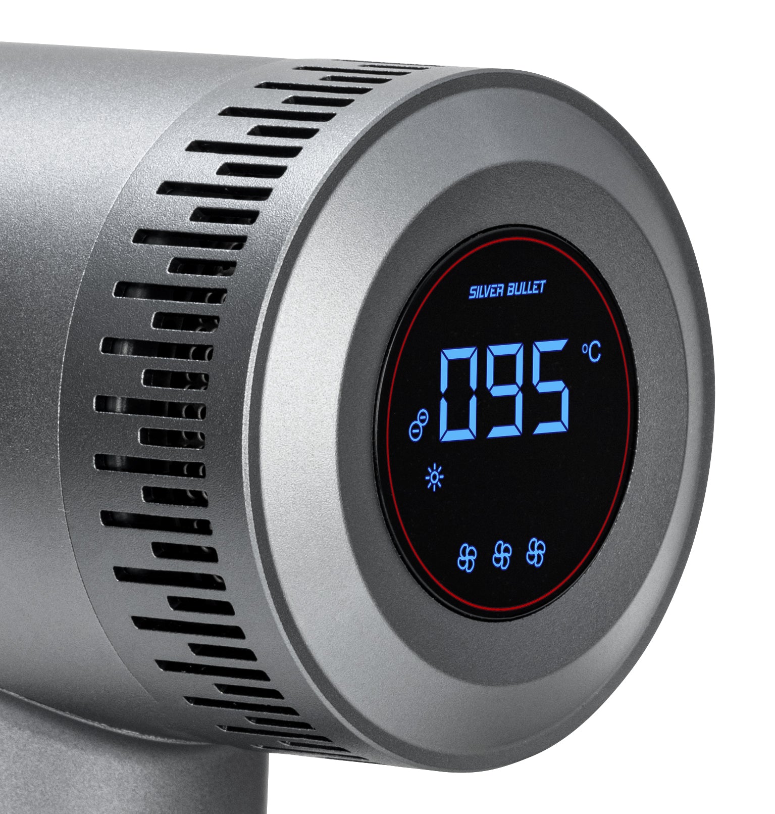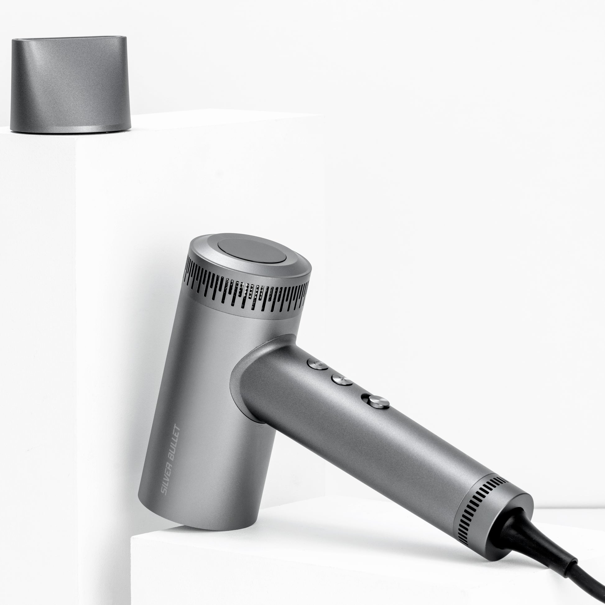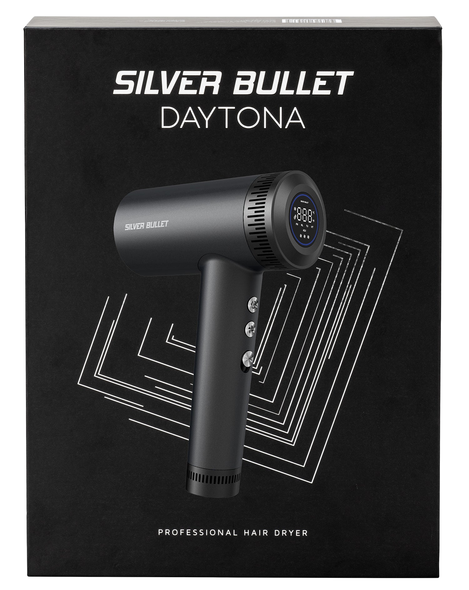 Blow-drying is a race. Silver Bullet Daytona Hair Dryer is faster and better. Speed past traditional hair dryers with this brilliantly lightweight, compact hair dryer, driven to success by a high power 1000 hour, 105,000 rpm 29mm BLDC motor. Five performance modes: fine, normal, turbo, hot and manual, including 7 heat/3 speed manual settings, for all styling needs. Ionic generator for frizz-free, shiny results. Auto self-cleaning function makes life easier. Digital display is a breeze to use. A sleek, futuristic hair dryer which outpaces the rest.