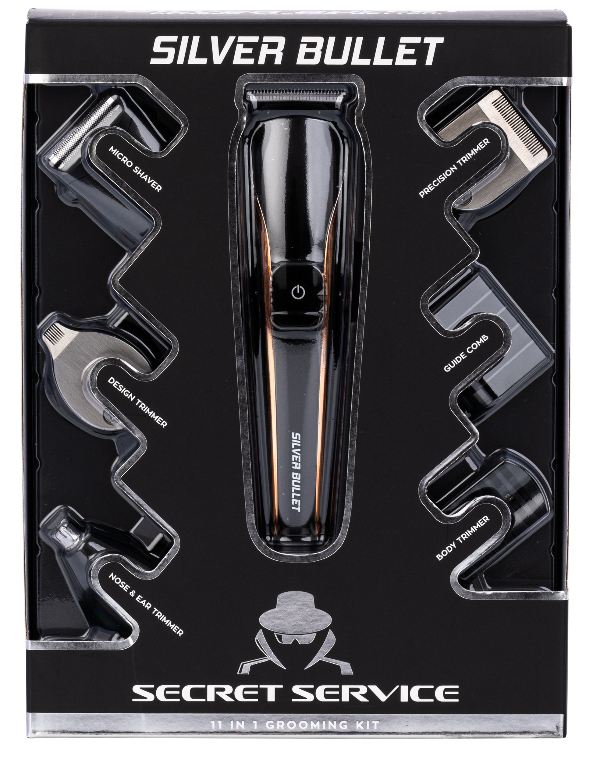 All-in-one premium grooming. Silver Bullet Secret Service 11-in-1 Grooming Trimmer Kit includes 11 attachments and clipper guards for maximum multipurpose. Six, easy-to-fit heads for advanced styling (full-size trimmer, precision trimmer, design trimmer, nose and ear trimmer, body trimmer and micro shaver). Four comb attachments and an adjustable attachment for precision trimmer head. Built-in rechargeable lithium battery with USB rapid charging system so you can charge anywhere, anytime. Sleek yet stylishly robust design.
