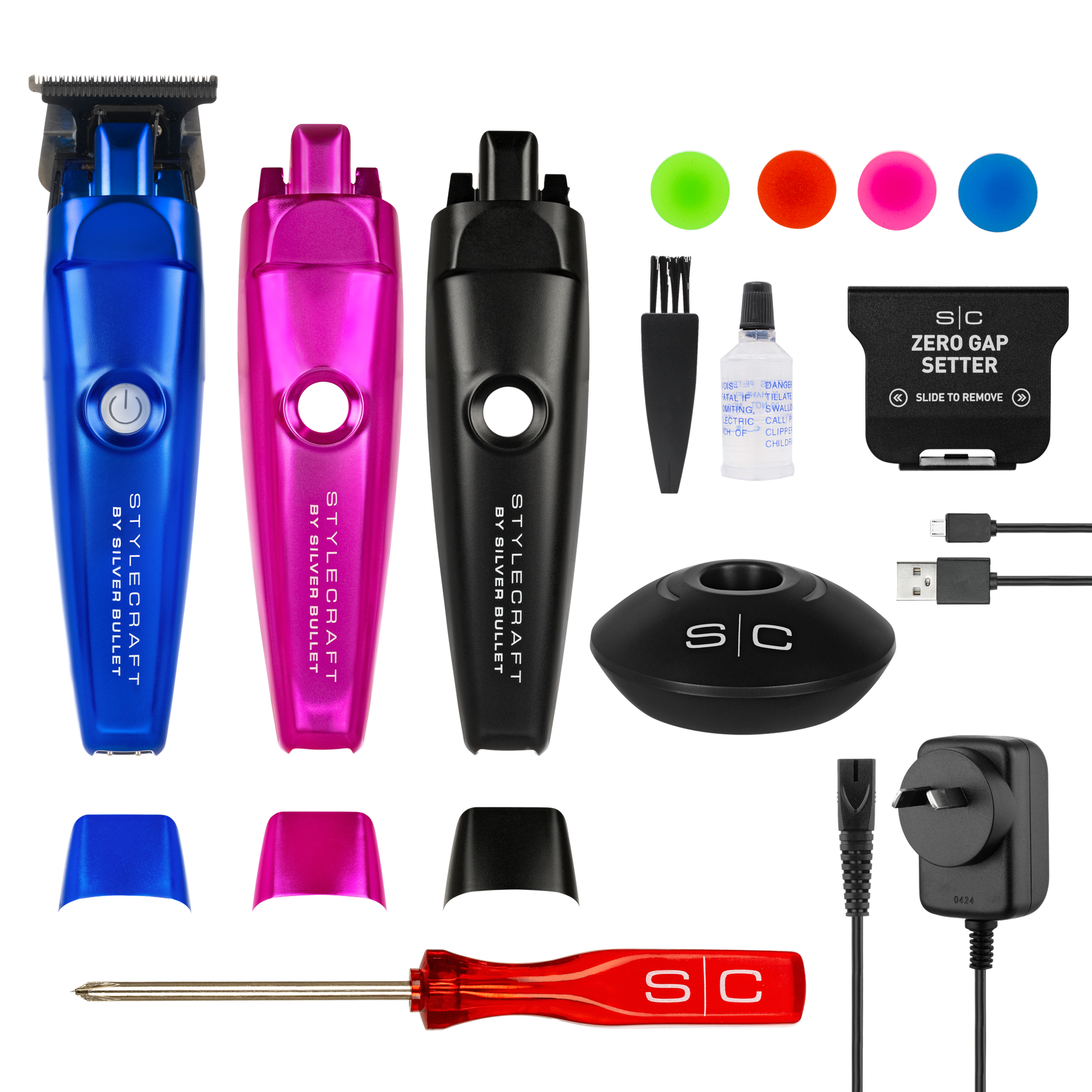 StyleCraft by Silver Bullet Rebel Hair Trimmer is all about super-torque and super customisation. Super-torque motor runs at 7,500 RPM for optimised bulk removal and creating the sharpest lines with a single tap. Fixed stainless steel X-Pro wide blade and DLC shallow tooth 2.0 cutting blade for the smoothest, crunchiest cutting and ultra-sharp lines. Fully adjustable blade is easily zero gapped. Skeleton design for 360° of visibility. Lithium battery with 3 hours of cordless runtime. Micro USB rechargeable. Compact and lightweight with an ergonomic design. The best bit? Pink, blue and black interchangeable body kits for ultimate customisation.
