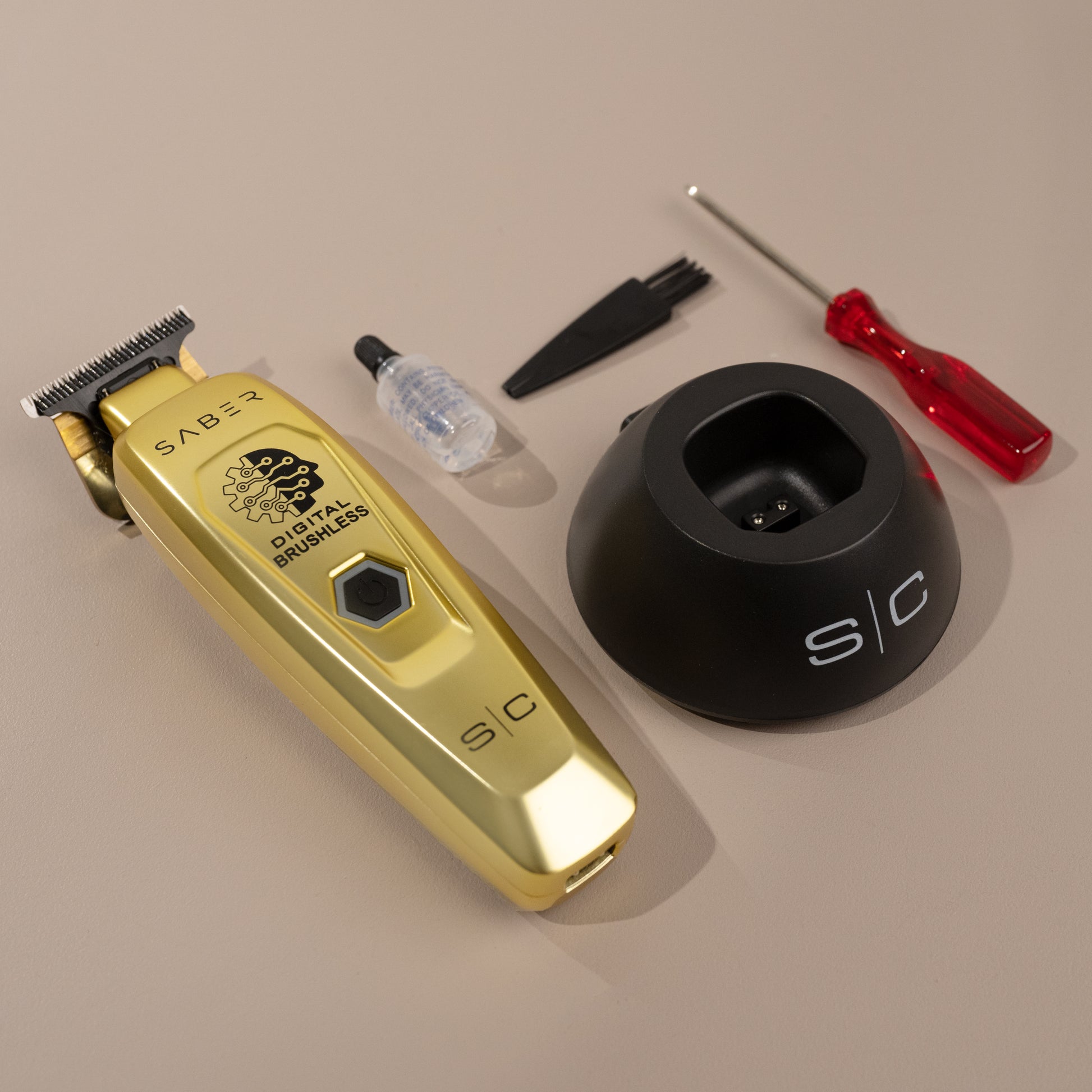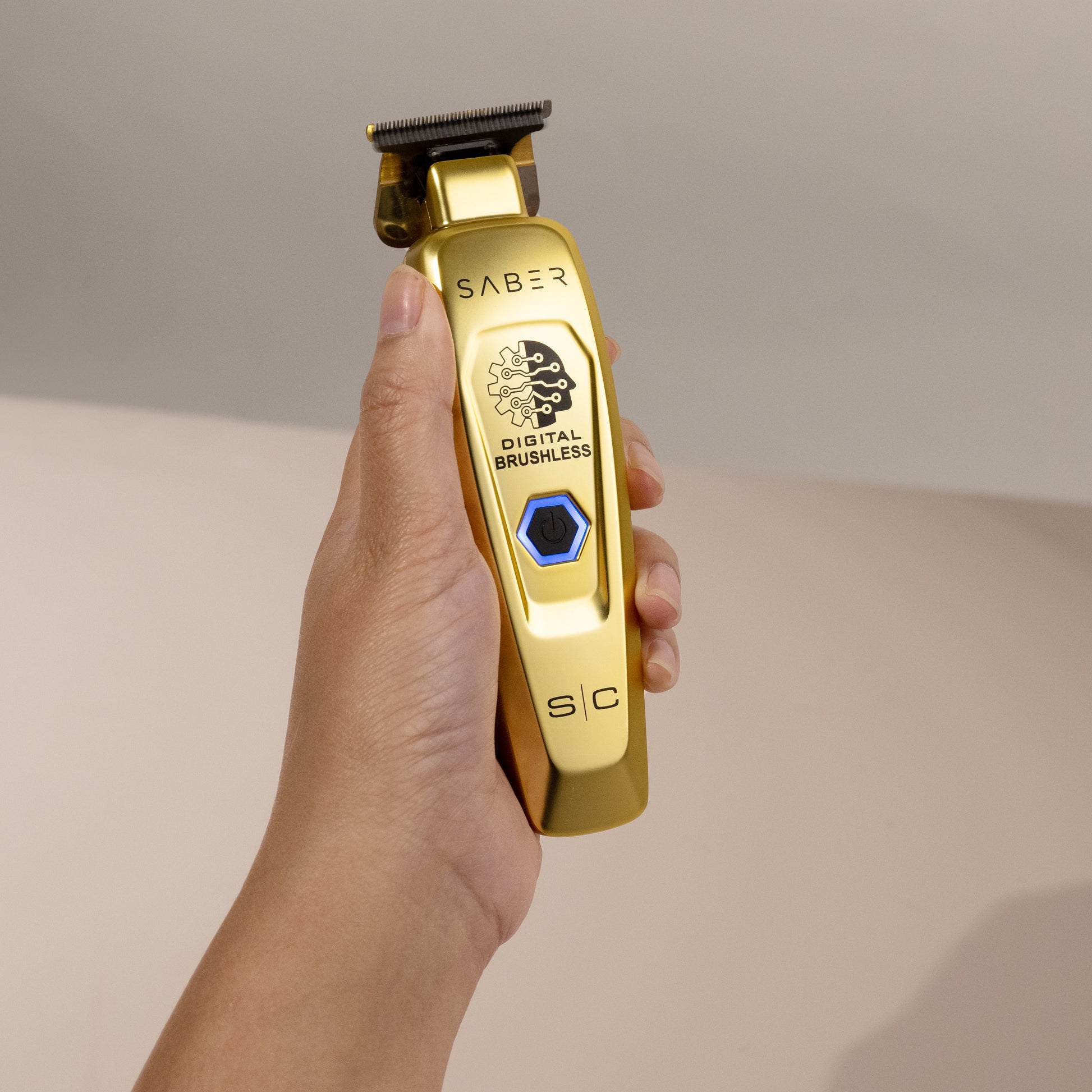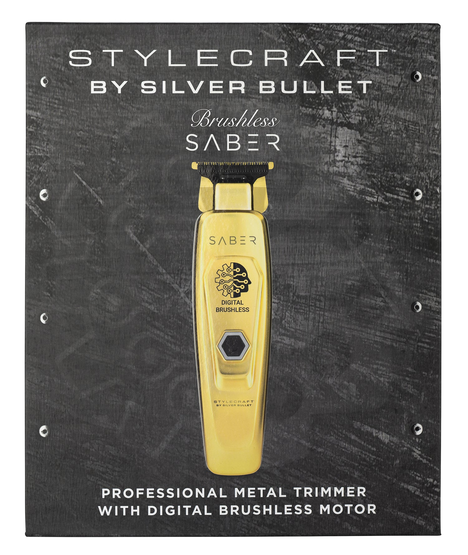 This is it. StyleCraft by Silver Bullet Saber Hair Trimmer is a hero trimmer with all-metal body, skeleton design and 360° exposed blade. High torque, long-life, low vibration, digital brushless motor runs at 7,500 rpm. Black Diamond The One deep tooth cutting blade for fast, smooth cutting (no pulling!) and Gold Titanium X-Pro wide fixed blade for sharper lines. Fully adjustable blade can be zero gapped for the closest cut and finish. Skeleton design exposes blade for 360° visibility. Lithium ion battery delivers four hours of cordless runtime with 90 minute recharge. Universal micro USB, charging base or cord recharging.